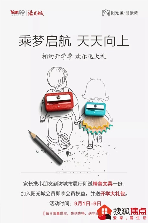 阳光城·丽景湾,开学送好礼!9月1日——9月9日,家长携小朋友到访城市展厅,可获赠精美文具!,加入阳光城会员,还可获赠开学大礼包!